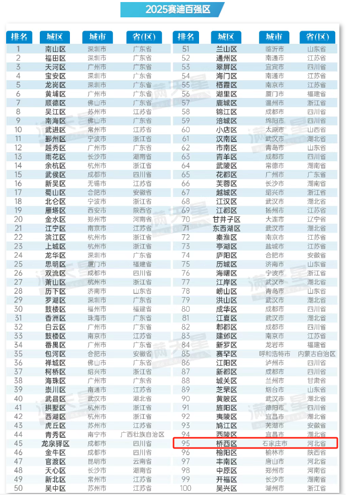 近日,赛迪顾问城市经济研究中心发布《2025年中国城区经济高质量发展研究报告》,石家庄市桥西区成功上榜2025赛迪百强区榜单。