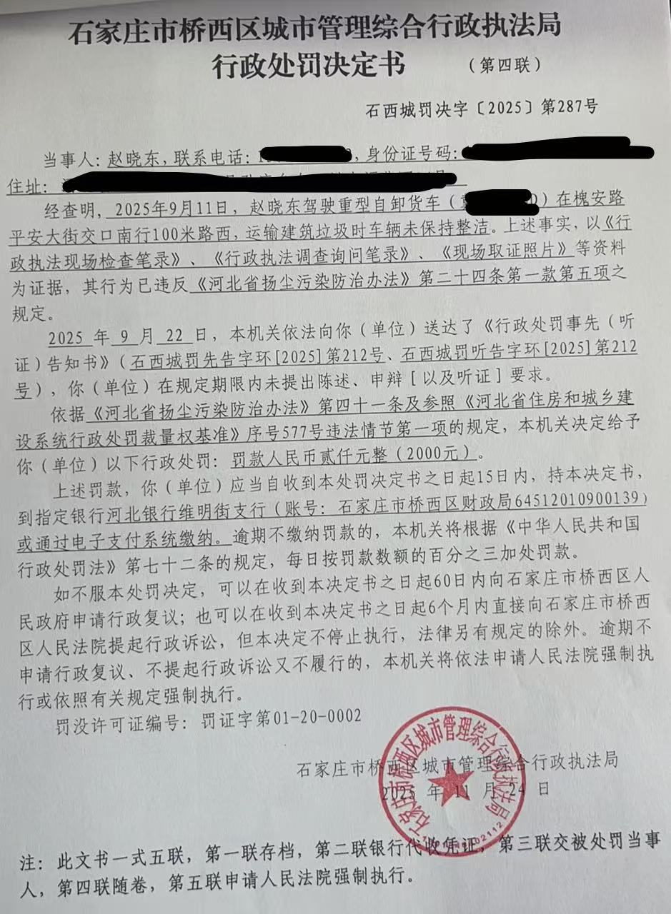 经上级交办,2025年9月11日21时20分到21时50分,我局执法人员王建良、渠剑飞发现赵晓东驾驶重型自卸货车在槐安路与平安大街交口南行100米路西,运输建筑垃圾时车辆未保持整洁。经初步调查,当事人赵晓东的行为违反了《河北省扬尘污染防治办法》第二十四条第一款第五项之规定。 | ||