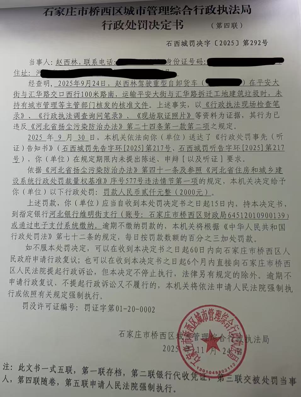 经检查发现,2025年9月24日09时40分到10时10分,我局执法人员王建良、渠剑飞发现赵西林驾驶重型自卸货车在平安大街与汇华路交口西行100米路南,运输平安大街与汇华路拆迁工地建筑垃圾时未持有城市管理等主管部门核发的核准文件。经初步调查,当事人赵西林的行为违反了《河北省扬尘污染防治办法》第二十四条第一款第二项之规定 | ||