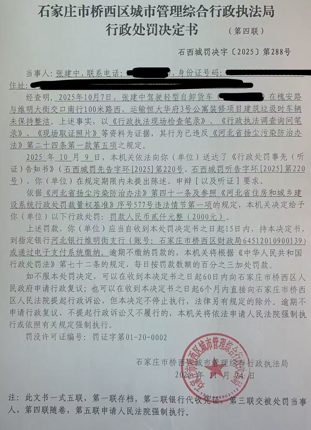 经检查发现,2025年10月7日15时00分到15时20分,我局执法人员王建良、渠剑飞发现张建中驾驶轻型自卸货车在槐安路与维明大街交口南行100米路西,运输恒大华府3号公寓装修项目建筑垃圾时车辆未保持整洁。经初步调查,当事人张建中的行为违反了《河北省扬尘污染防治办法》第二十四条第一款第五项之规定。 | ||