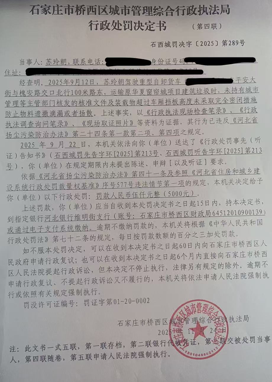 经检查发现,2025年9月12日03时30分到04时45分,我局执法人员王建良、渠剑飞发现苏玲朝驾驶重型自卸货车在平安大街与槐安路交口北行100米路东,运输原华夏窗帘城项目建筑垃圾时未持有城市管理等主管部门核发的核准文件及装载物超过车厢挡板高度并未采取完全密闭措施防止物料遗撒滴漏或者扬散。经初步调查,当事人苏玲朝的行为违反了《河北省扬尘污染防治办法》第二十四条第一款第二项、第四项之规定 | ||