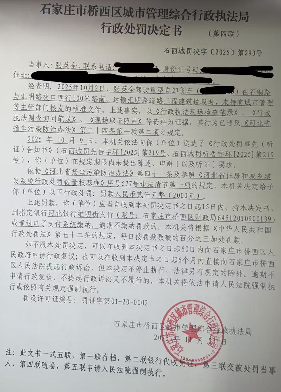 经检查发现,2025年10月2日22时20分到22时40分,我局执法人员王建良、渠剑飞发现张英全驾驶重型自卸货车在石铜路与汇明路交口西行100米路南,运输汇明路道路工程建筑垃圾时未持有城市管理等主管部门核发的核准文件。经初步调查,当事人张英全的行为违反了《河北省扬尘污染防治办法》第二十四条第一款第二项之规定。 | ||