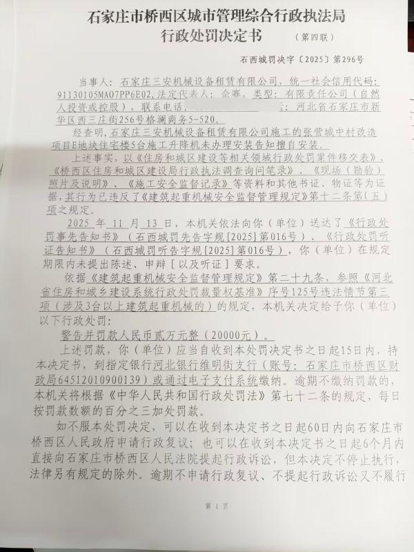 石家庄三安机械设备租赁有限公司施工的张营城中村改造项目,违法“建设工程安全生产”。296号