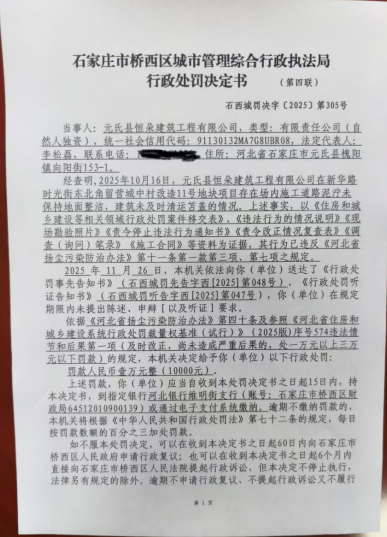 元氏县恒朵建筑工程有限公司施工的留营城中村改造11号地项目“建设工程施工扬尘污染”案(305)
