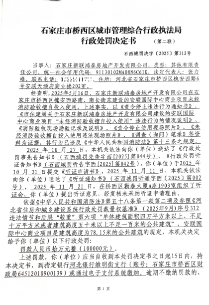 石家庄新联鸿泰房地产开发有限公司建设的安联国际中心商业项目“未经消防验收擅自投入使用”案(312)
