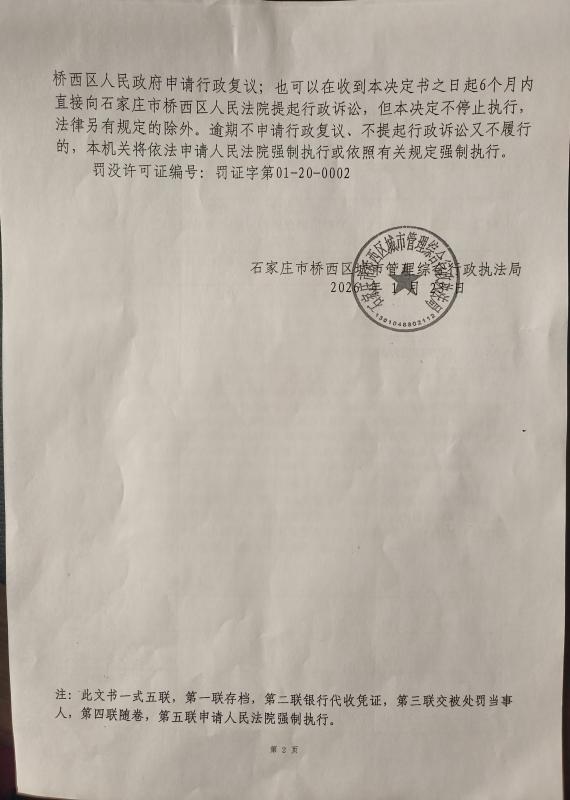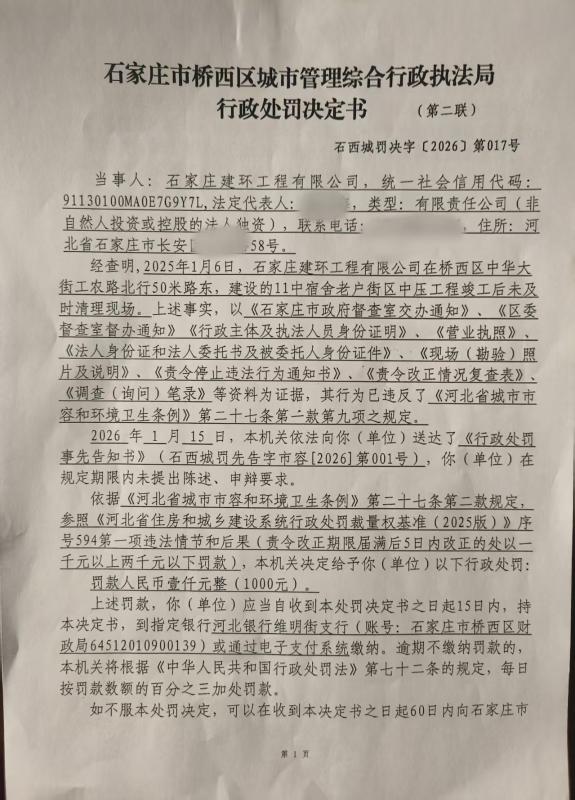 2026年1月6日桥西区城市管理综合行政执法局执法人员娄锡昌执法证号:03011616186,杨京会执法证号:03011616012,接上级交办,石家庄市建环工程有限公司在中华大街工农路北行五十米路东11中宿舍老户街区中压工程竣工后未及时清理施工场地,经查该公司未在责令改正期限完成立即改正要求,违反了《河北省城市市容环境卫生条例》第二十七条第一款第九项的规定。 | ||