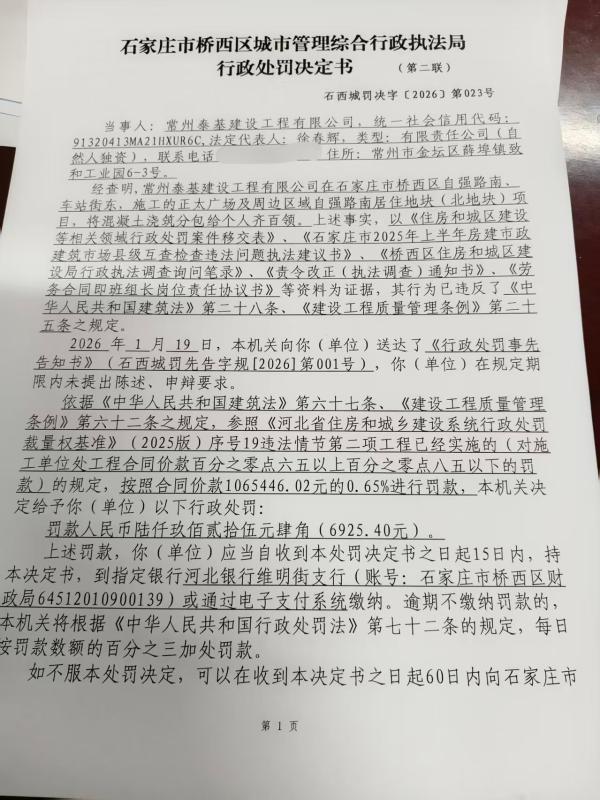 依据《中华人民共和国建筑法》第六十七条、《建设工程质量管理条例》第六十二条之规定、参照《河北省住房和城乡建设系统行政处罚裁量权基准》(2025版)序号19违法情节第二项工程已经实施的,对常州泰基建设工程有限公司作出罚款人民币6925.40元。 | ||