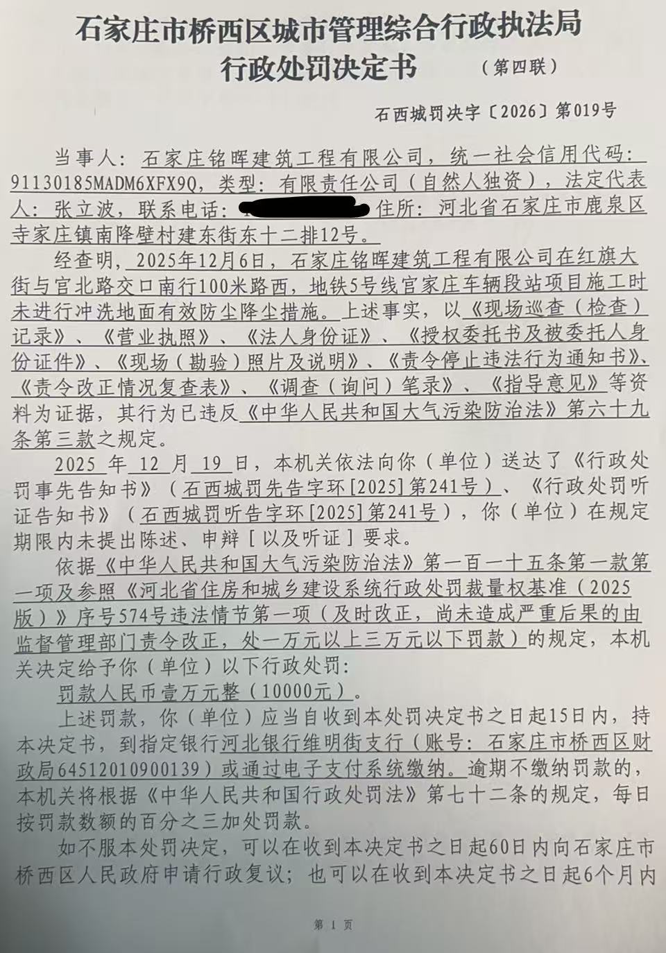 经检查发现,2025年12月6日10时30分到11时00分,我局执法人员王建良、渠剑飞巡查红旗大街与宫北路交口南行100米路西发现石家庄铭晖建筑工程有限公司在地铁5号线宫家庄车辆段站项目施工时,未进行冲洗地面有效防尘降尘措施。经初步调查其行为违反了《中华人民共和国大气污染防治法》第六十九条第三款之规定 | ||