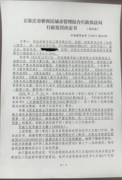 桥西区住建局执法人员于2025年12月17日对桥西区汇通路以西,交投大厦以南河北洲誉市政工程有限公司施工的高铁片区48号地块项目巡查时发现,存在场内施工道路积尘严重未保持地面整洁,车辆清洗平台损坏无法使用的情况。其行为违反了《河北省扬尘污染防治办法》第十一条第一款第三项、第四项的有关规定。 | ||