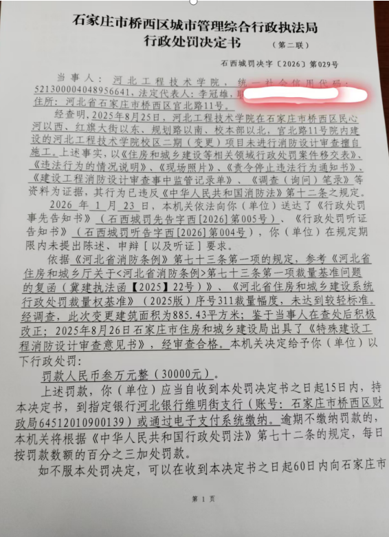 河北工程技术学院违法建设河北工程技术学院校区二期(变更)项目未进行消防设计审查擅自施工(029)