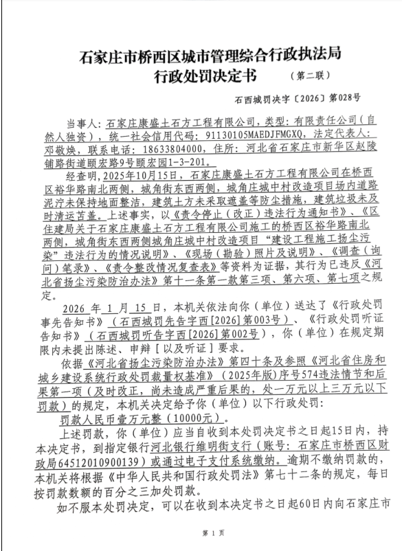 区住建移送案件,2025年10月15日,区住建局在对石家庄康盛土石方工程有限公司施工的桥西区裕华路南北两侧,城角街东西两侧城角庄城中村改造项目进行巡查时发现现场存在场内道路泥泞未保持地面整洁,建筑土方未采取遮盖等防尘措施,建筑垃圾未及时清运苫盖的情况。违反了《河北省扬尘污染防治办法》第十一条第一款第三项、第六项、第七项有关规定。
