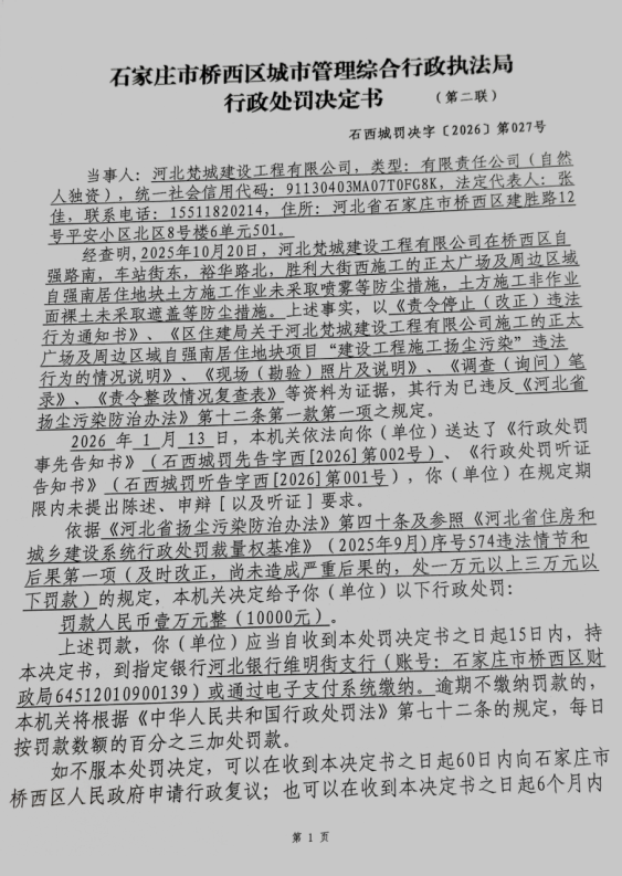 2025年10月20日,区住建局在对该项目进行巡查时发现现场存在土方施工作业未采取喷雾等防尘措施,土方施工非作业面裸土未采取遮盖等防尘措施的情况。违反了《河北省扬尘污染防治办法》第十二条第一款第一项有关规定。 | ||